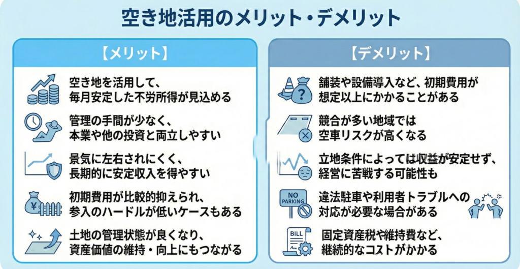 ここでは、駐車場経営のメリット・デメリット、よくある失敗、月極とコインパーキングの違い、始め方までを、初心者向けにやさしく整理していきます。