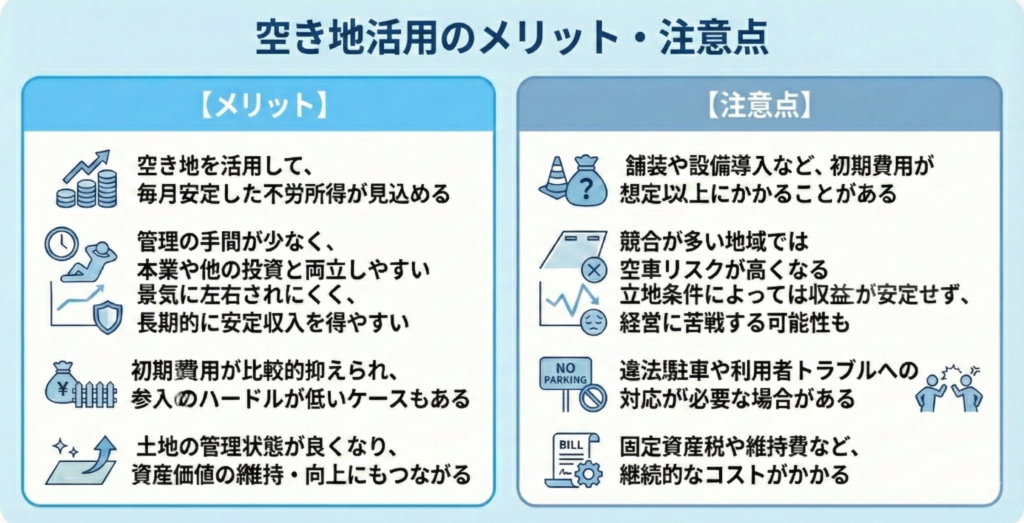 また、建物がないぶん、将来「売却したい」「別用途にしたい」となったときも、比較的柔軟に動ける点も強みです。