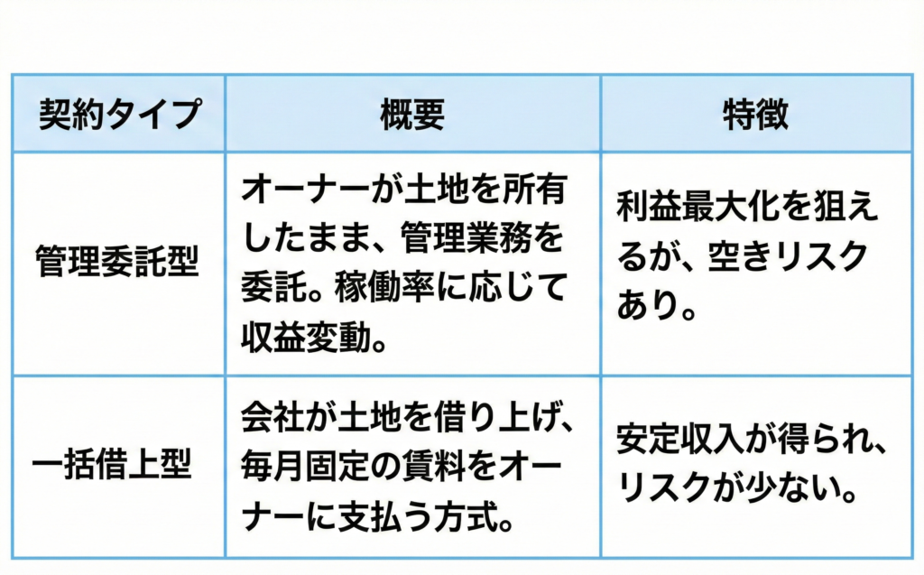 「安定を重視するなら借上型」「自分で価格を設定したいなら委託型」がおすすめです。